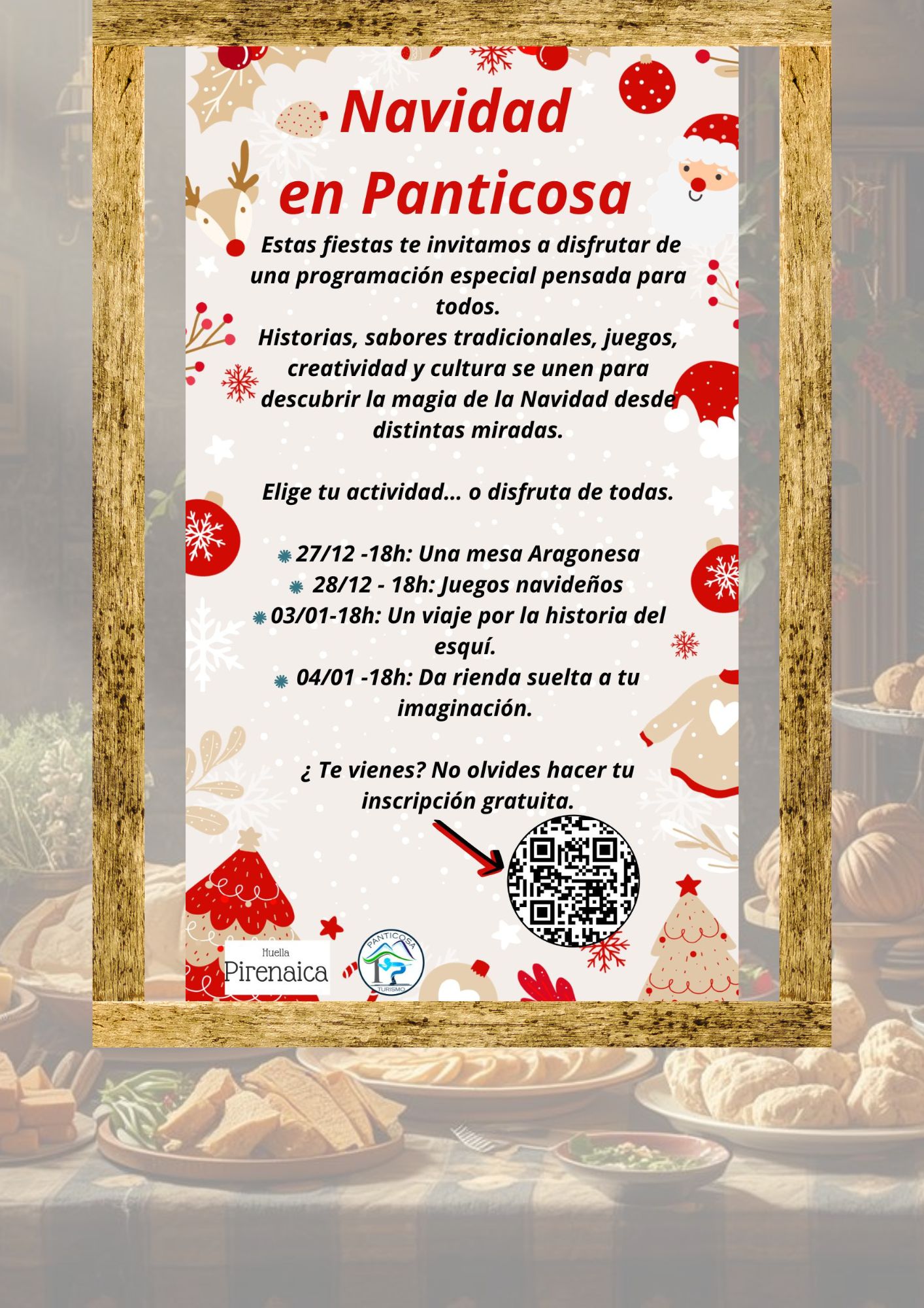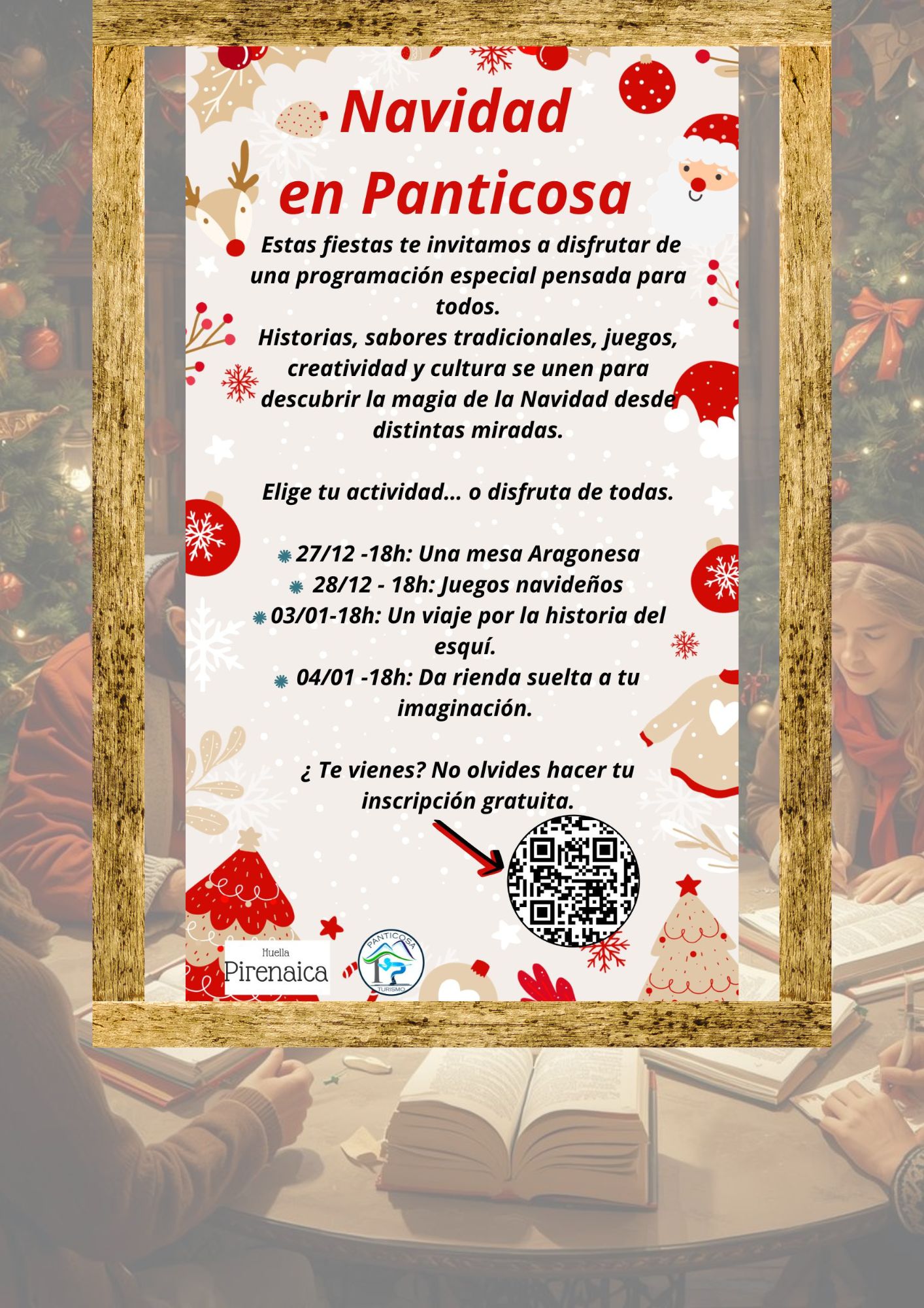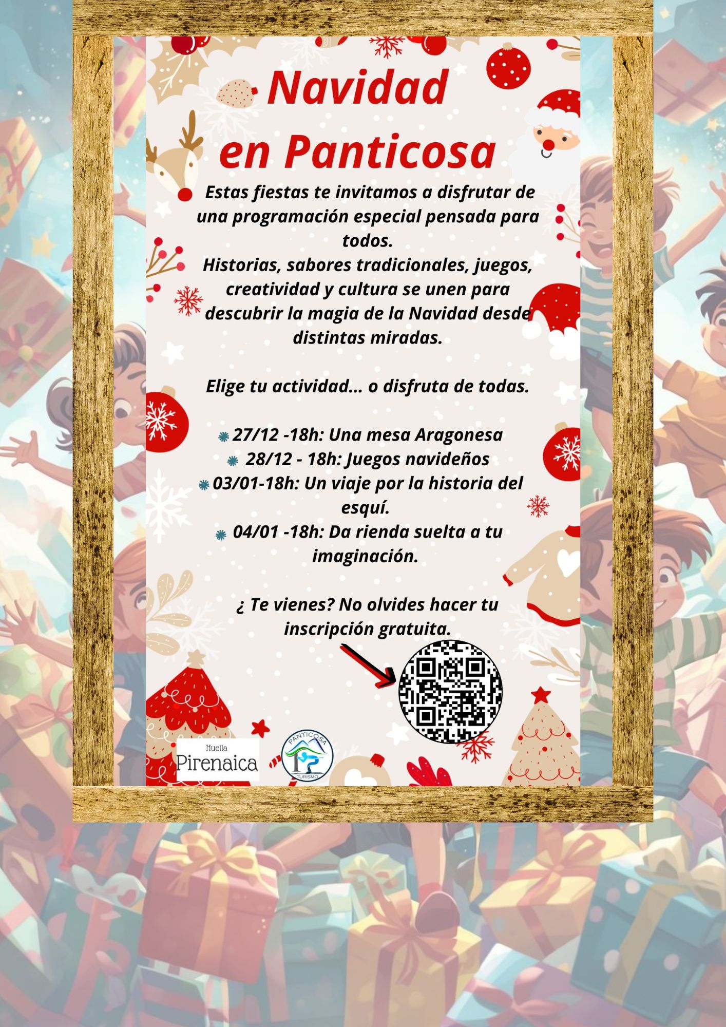Oficina de Turismo27 y 28 de diciembre / 3 y 4 de eneroActividades gratuitas · Imprescindible reserva previa Estas fiestas te invitamos a disfrutar de una programación especial en Panticosa pensada para todos los públicos. Cuatro propuestas que combinan cultura, tradición, creatividad y patrimonio para descubrir la Navidad desde distintas miradas. PROGRAMACIÓN 27 de diciembre a las