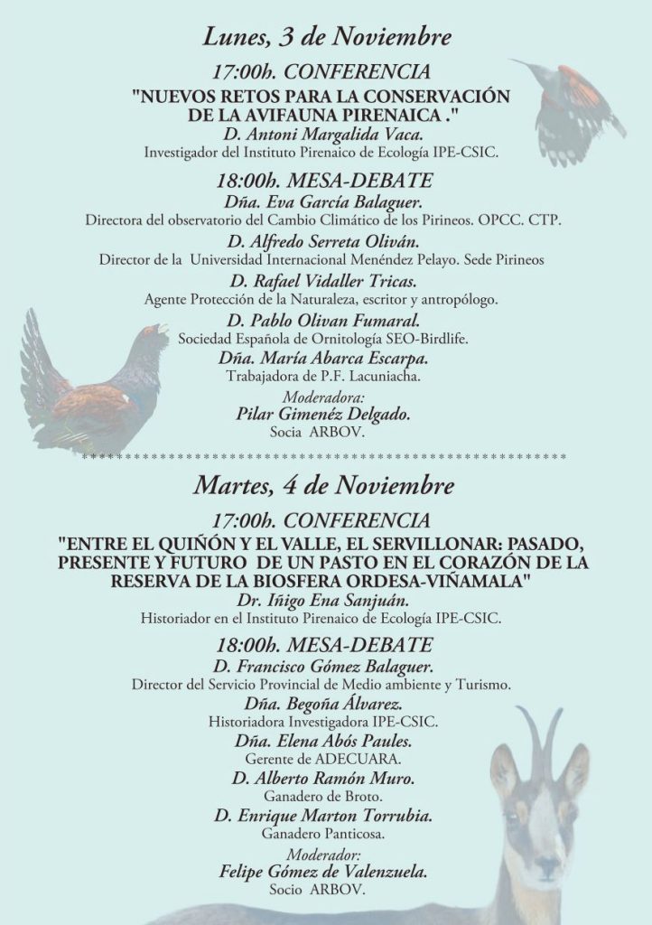Como en ediciones anteriores, se han organizado diferentes conferencias y mesas debate sobre la pérdida y evolución de la biodiversidad en la región alpina RBOV y en esta ocasión se contará también con expertos científicos y divulgadores del Instituto Pirenaico de Ecología, Universidad Internacional Menéndez Pelayo, la Sociedad Española de Ornitología, gestores de espacios y ganaderos entre otros invitados.